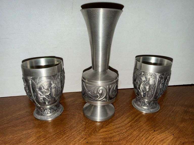 Cast pewter set by SKS Zinn comprising 1 flared vase and 2 goblets with embossed designs. Vase features scrollwork accents, goblets depict intricate scenes. Approximate height: Vase 5.5”, goblets 3”.