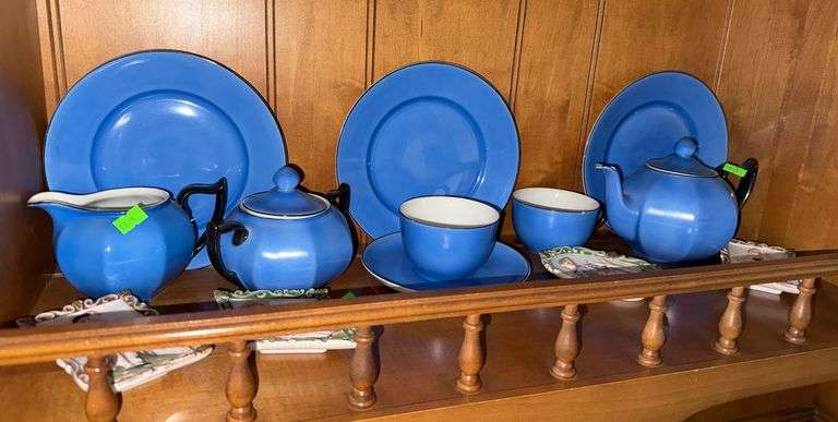 Blue ceramic tea service featuring 2 saucers, plates, teacups, a creamer, a sugar bowl with lid, and a teapot. Each piece is accented with black handles and rims.