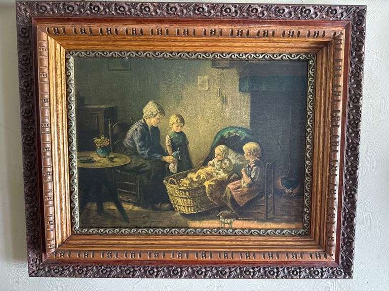 Oil painting on canvas depicting a domestic scene with figures, housed in a carved wood frame. Artwork and frame dimensions approx. 22.5”x18.5”. Frame features intricate detailing with inner and outer border carvings.