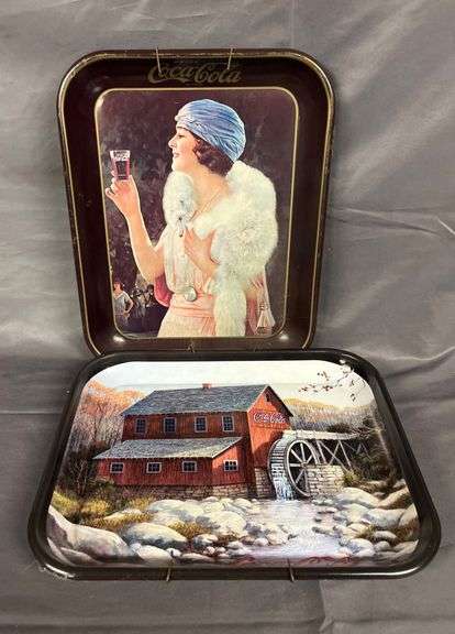 2 Coca-Cola tin trays. One depicts a 1920s woman with a drink, the other a mill scene by Jim Harrison. Both feature Coca-Cola branding. Made in the U.S.A., dated 2000.
