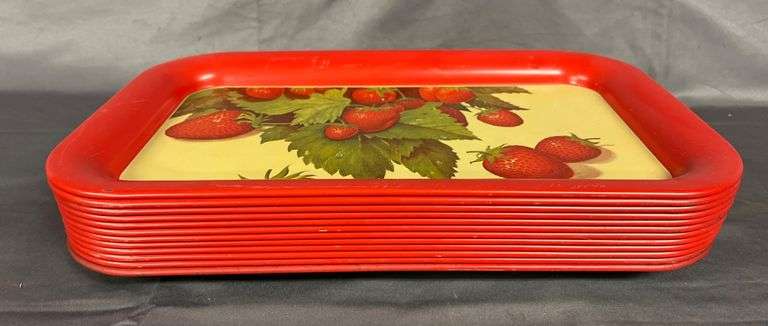 12 rectangular red trays featuring a strawberry motif on the top surface. Each tray measures 14 1/4 x 8 3/4.
