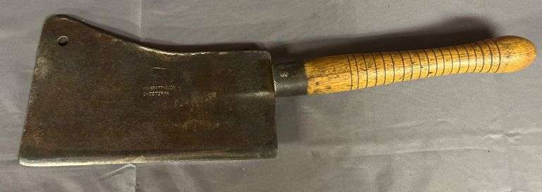 Wm. Beatty & Son meat cleaver featuring a marked steel blade reading ‘Wm. Beatty & Son, Chester PA’ and a grooved wood handle. Blade includes a hanging hole. Approx. 14 in. overall length.