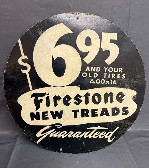 Round cardboard Firestone advertising sign, 16 1/2” diameter, displaying promotional text and pricing for new treads. Features a bold graphic design and text in black and white.