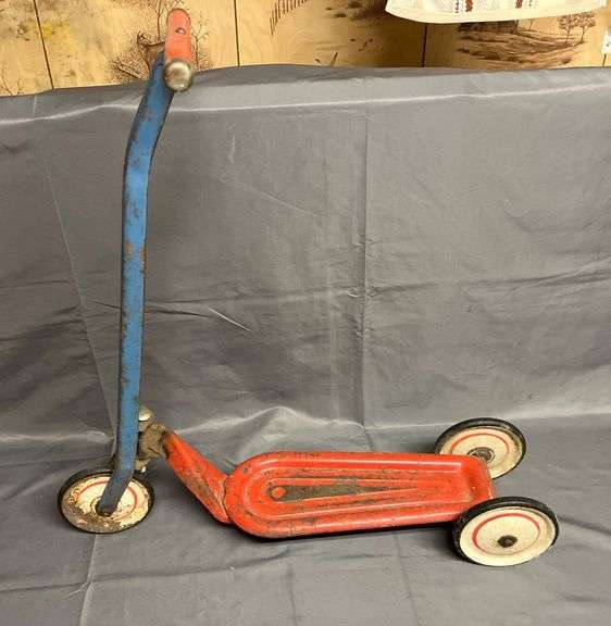 3-wheel child’s scooter featuring a red metal deck with raised design and blue metal handlebar. Approximate length, 24 in.