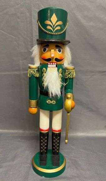 15” nutcracker made of painted material, featuring a green uniform with gold-tone accents, white hair and beard, and a gold-tone scepter. Labeled ‘Holiday Workshop’ on the base.