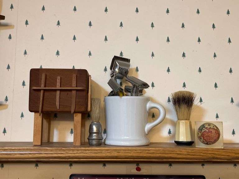 Grooming items inc. clippers, shaving brushes, and a cream-colored mug, displayed alongside a wood box and resin paperweight with embedded floral design.