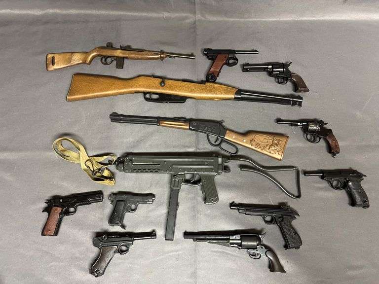 13 toy guns constructed from plastic and metal. Includes rifles, handguns, and revolvers with varying finishes, handles, and details. Includes lever-action and bolt-action style rifles, semi-automatic style replicas, and double-action type revolvers.
