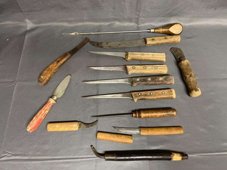 Knives marked R.H. Forschner Co. and assorted hand tools with wood handles. Includes 4 Forschner knives, carving tools, and other blades.