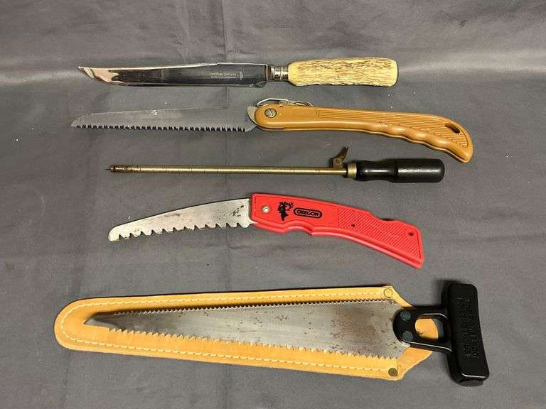 5 cutting tools including a stainless steel knife by Lifetime Cutlery (Sheffield, England), pruning saws with folding and fixed blade designs, and a specialized hand tool with black handle.