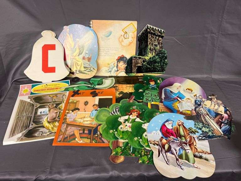 Die-cut paper items featuring Christmas, St. Patrick’s Day, and religious nativity scenes. Includes flat and layered designs of angels, Mary and Joseph, shamrocks, and family illustrations.