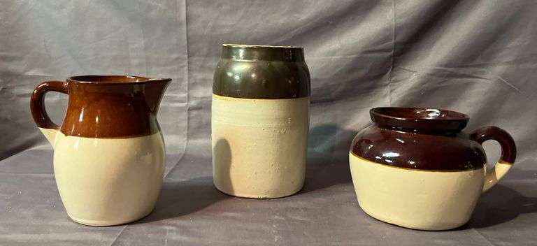 3 ceramic items, including 2 pitchers (1 spouted) and 1 lidded jar. Brown and cream glaze finishes. .