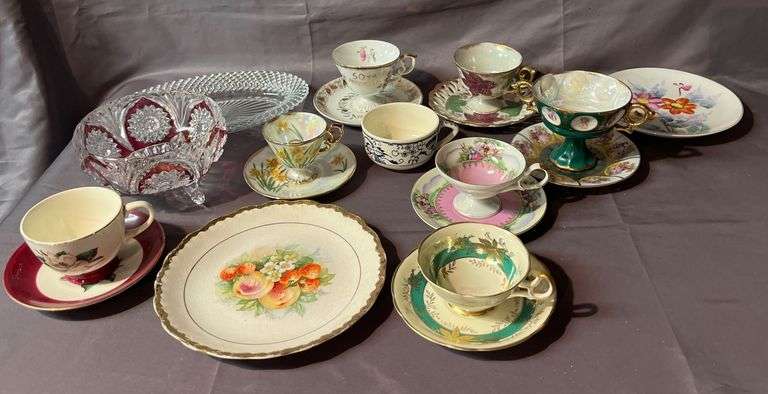 Fine china teacups and saucers from makers like Lifetime China Co., Wheelock Peoria, Fan Crest, and Cugo, with designs including florals, celebratory motifs, gilded accents, and ornamental patterns. Includes 2 decorative plates and 2 glass pieces: a cut-glass oval platter and a red-accented crystal bowl.