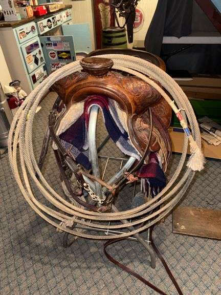 Leather saddle with 14” seat featuring embossed details and fleece underside, paired with a 29”x17” stand.