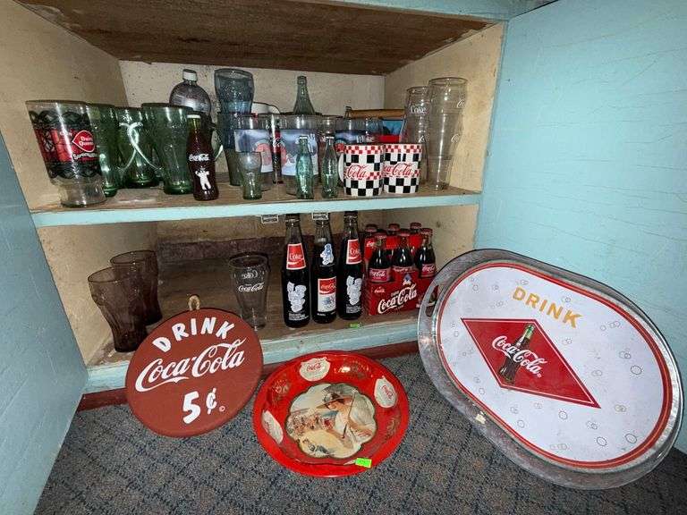 Coca-Cola collectibles Inc. branded glassware, bottles, metal trays, and decor items. Glasses feature various designs, Inc. frosted, checkered, and green glass. Bottles range from vintage-style replicas to modern commemoratives. Includes 3 metal trays with Coca-Cola advertising graphics.