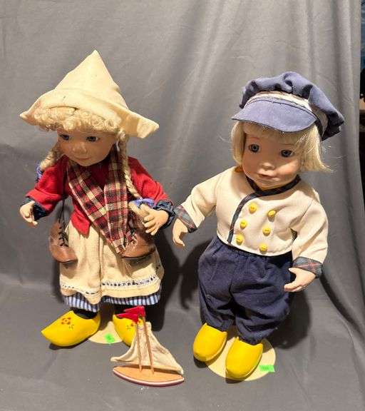 Porcelain boy and girl dolls, both 16” tall, dressed in Dutch-inspired clothing, inc. traditional hats, clogs, and accessories. Includes a small wood sailboat accessory. Clothes feature detailed fabric and button accents.