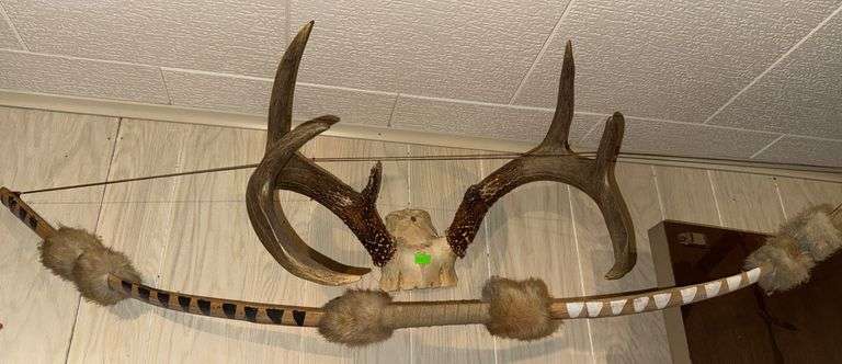 LOT 729 - Bow with Animal Hide Trim and Deer Antler Display