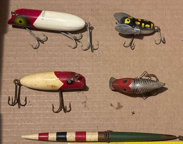 5 fishing lures and 1 bobber. Brands include Heddon Tiny Crazy Crawler and South Bend Bass-Oreno. Features varied materials and designs, and all include hooks. Approximate lengths: lures range from 2.5-4.5 in; bobber is 7 in.