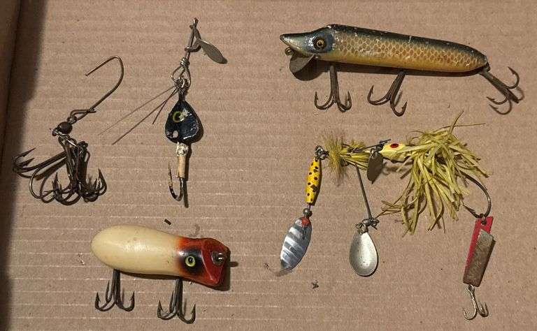5 fishing lures of various designs, materials, and colors. Includes hard-bodied lures with intricate features, spinnerbait, and multi-hook rigs. Some lures feature engraved markings.