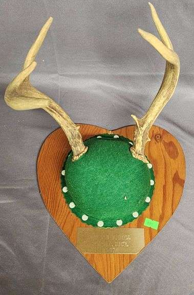 Mounted deer antlers secured on a green fabric-covered base with a heart-shaped wood plaque. Features a brass plaque engraved 'Arnold W. Doll, Sagola, Mich, 1967.'