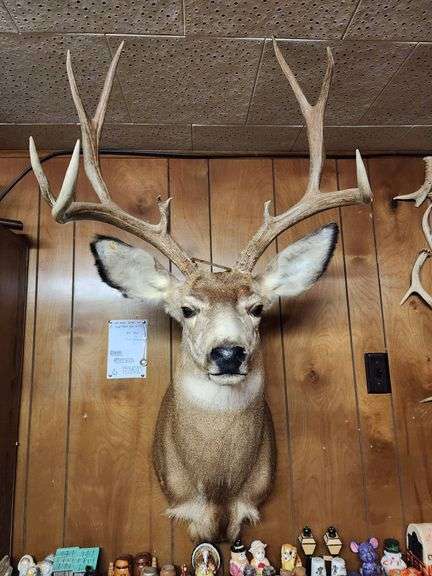 Taxidermy mule deer shoulder mount featuring prominent antlers. Brass plaque reads 'Mule Deer Taken by Arnold Doll, Hulett, WY, 11-18-1995.'