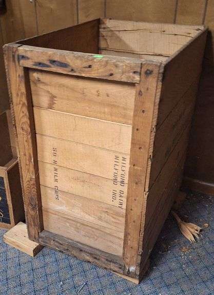 Milk bottle crate featuring stenciling with 'Milford Dairy, Milford, ind.' and 'Mid-West Milk Bottle Case Co.' markings. Constructed of slatted and reinforced wood. Dimensions: 16x23x26.