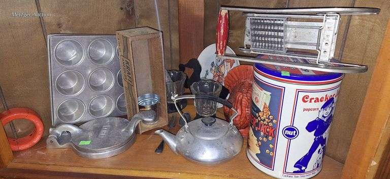 Items including aluminum kettles, glass goblets, Cracker Jack tin, and cooking molds. Includes various vintage kitchen tools.