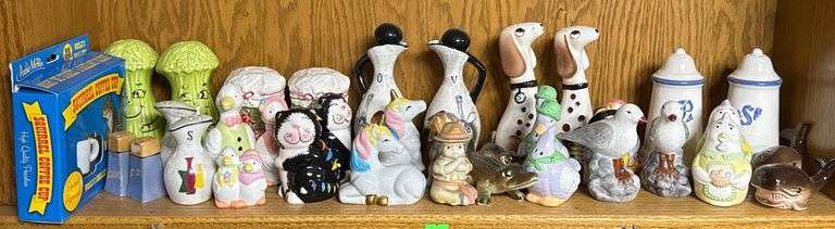 Variety of ceramic and porcelain salt and pepper shakers depicting animals, figurines, and more. Includes novelty shapes such as dogs, birds, mushrooms, and unicorns.