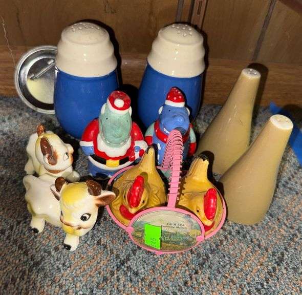 Ceramic salt and pepper shakers with various designs, Inc. cows, holiday-themed figures, chickens in a basket, and cone-shaped pieces. Includes a total of 5 pairs.