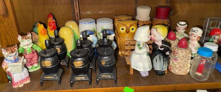 Ceramic and metal collectible figurines and shakers, Inc. novelty designs like owls, stoves, and characters.
