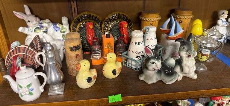 Ceramic and metal salt and pepper shakers, featuring animal forms like rabbits, ducks, and turkeys, as well as nautical and trophy-themed designs. Includes hand-painted and molded details.