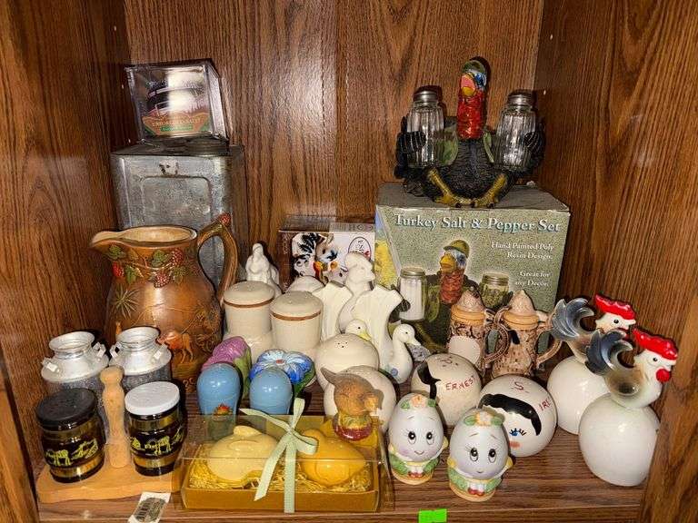 Ceramic and glass salt and pepper shakers in various designs and shapes, including novelty styles such as turkeys, hens, ducks, and anthropomorphic figures. Includes a boxed turkey shaker set.