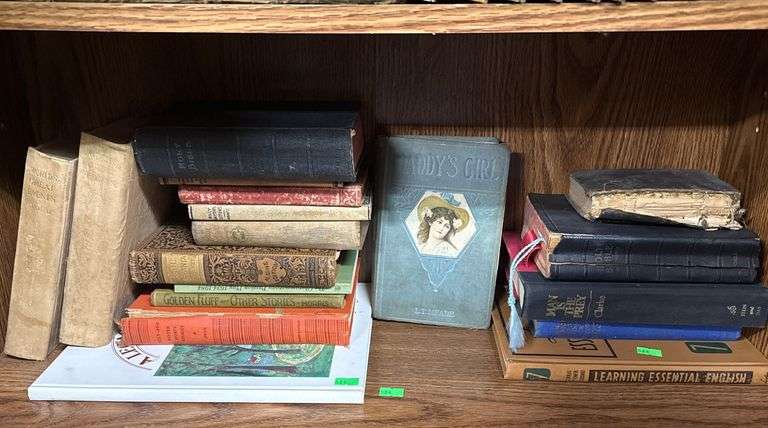 Group of books featuring hardcover and paperback volumes with varying titles covering topics such as fiction, religious texts, educational material, and literature. Includes prominent works like 'Eddy's Girl' and multiple leather-bound editions.
