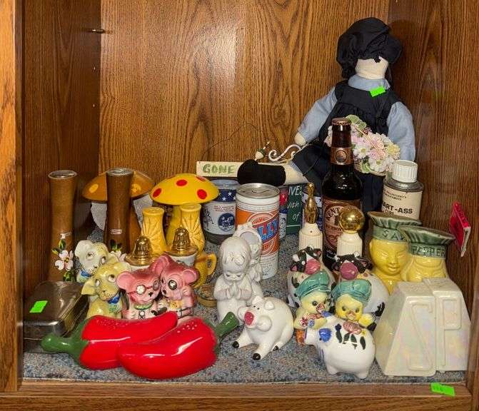 Collection of ceramic and novelty decorative items, including salt and pepper shakers, figurines, bottles, and tin items, featuring various designs such as anthropomorphic characters, mushrooms, and animals. Items are in assorted colors and materials.