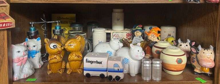Ceramic and glass figural salt and pepper shakers, featuring animal and character motifs, signed pieces, and branding such as Fingerhut. Includes squirrel, pig, cow, and witch designs.