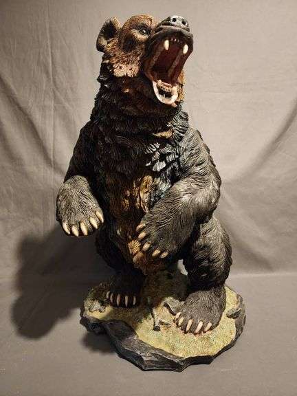 23″ tall resin bear figure featuring an open-mouth roar stance. Textured fur detailing and claws on a rock-like base.