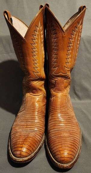 Dan Post western boots featuring lizard print leather uppers, stitch detailing, and pull loops. Worn soles and slight creasing on leather. Manufacturer markings on the interior.size 9.5
