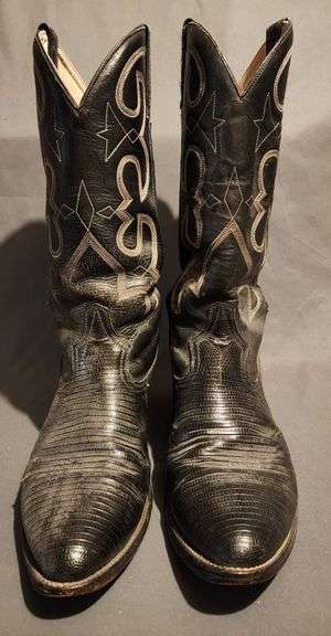 Black lizard leather western boots featuring intricate embroidery patterns and pointed toe design. Manufactured by Larry Mahan Boots, size 9.5.