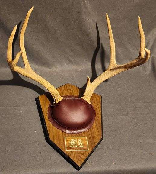 Wall-mounted 7-point deer antlers attached to a wood plaque with burgundy leatherette mount. Includes an engraved plate reading ‘Taken by Arnold Doll, Lovell Wyo., Oct. 15, 1989.’ Ready for wall display.