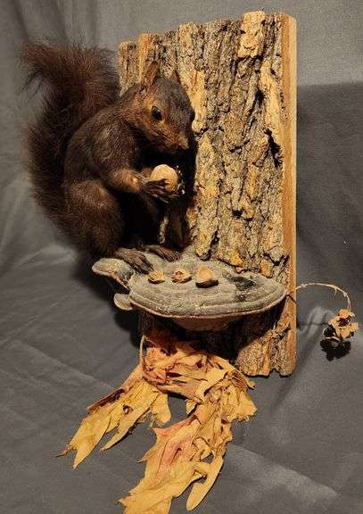 Taxidermy squirrel mounted on a wooden bark base holding an acorn, featuring a ledge with small decorative pebbles and faux leaves. Measures 11"x6".