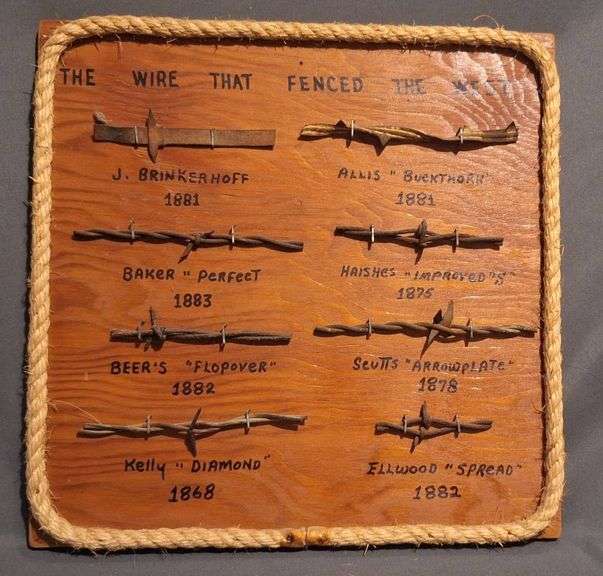 Wood plaque measuring 12″x12″ featuring 8 historical barbed wire samples with engraved labels. Includes rope border detail and sticker on reverse from Kracker Barrel, Eureka Springs, Arkansas.