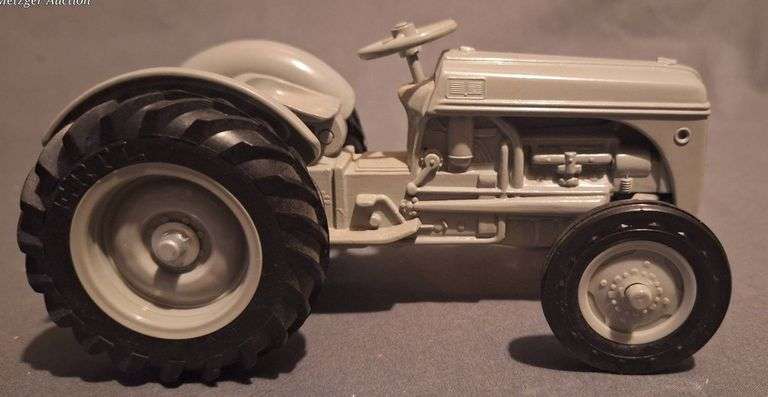 1:16 scale die-cast metal tractor with gray finish. Features detailed tires, steering wheel, and embossed markings on the underside, numbered U875.