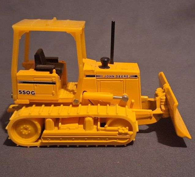 1:32 scale die-cast Ertl John Deere 550G bulldozer with functional blade and track details. Marked “Ertl, Dyersville, Iowa, USA, Made in China.”