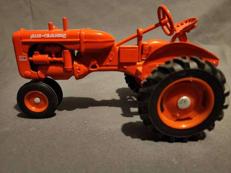 1/16 scale Allis-Chalmers model tractor in orange with rubber tires and detailed engine components. Features realistic steering wheel and molded details.