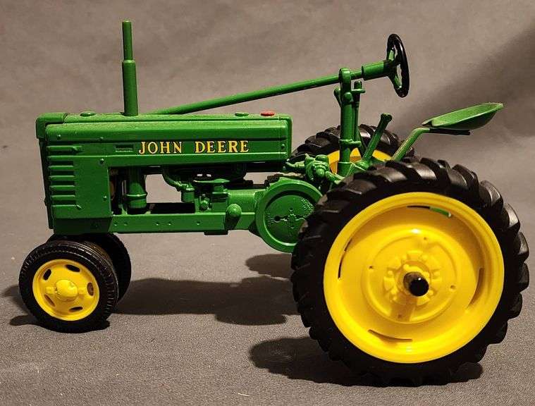 1/16 scale John Deere model tractor featuring green body with ‘John Deere’ branding and yellow wheels. Made of metal and plastic with intricate detailing, including a steering wheel and seat. Marked ‘0450SF’ underneath.