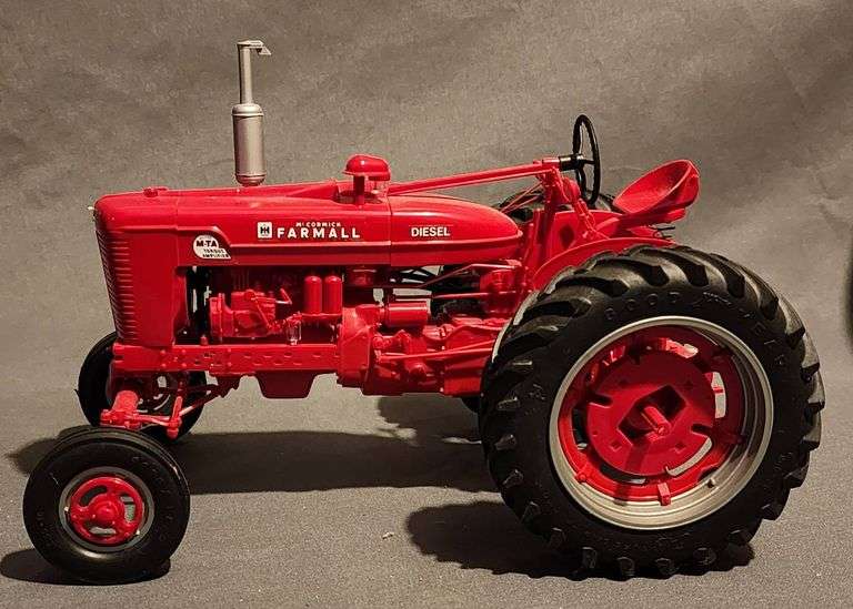 Die-cast 1/16 plastic model of a McCormick Farmall Super MTA Diesel tractor. Features detailed design with large tires and a red finish. Includes original box showing ‘Super Diesel MTA’ branding.