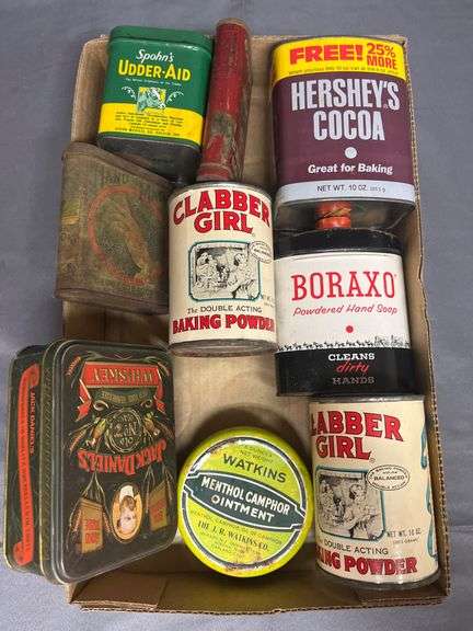 Box includes metal tins and containers for products Inc. Clabber Girl baking powder, Hershey’s cocoa, Union Leader tobacco, Boraxo soap, and Watkins ointment.