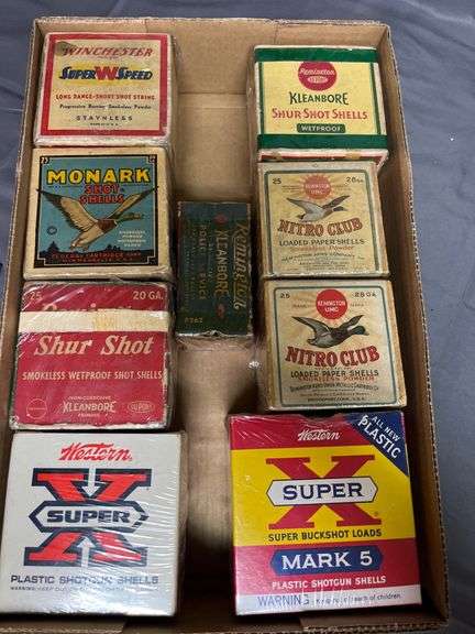 Shotshell boxes inc. Winchester, Monark, Remington, Western, and Nitro Club.
