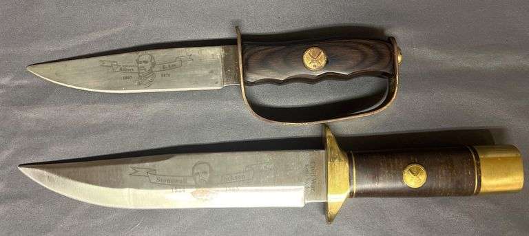 2 Civil War-themed knives engraved with portraits and dates for Robert E. Lee (9”) and Stonewall Jackson (12.5”), both featuring brass accents and wood grips.
