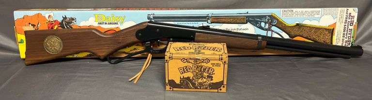Daisy Model 1938B Red Ryder BB gun marked with B-B Cal. 4.5mm/.177, featuring a commemorative medallion (1938–1988) on the stock. Includes BB Strongbox containing sealed BB ammunition packets. Manufactured in Rogers, AR, USA. Appears in original packaging.