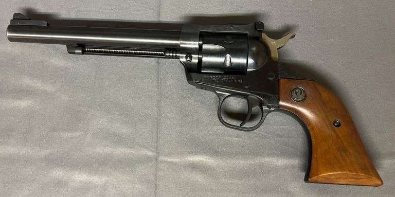Ruger New Model Single-Six revolver chambered in .22 caliber with a 6-inch barrel. Features a wood grip with manufacturer's medallion and a blued finish. Serial number 63-50013, manufactured by Sturm, Ruger & Co., Inc., Southport, Conn., USA. Includes 6-shot removable cylinder and ejector rod.